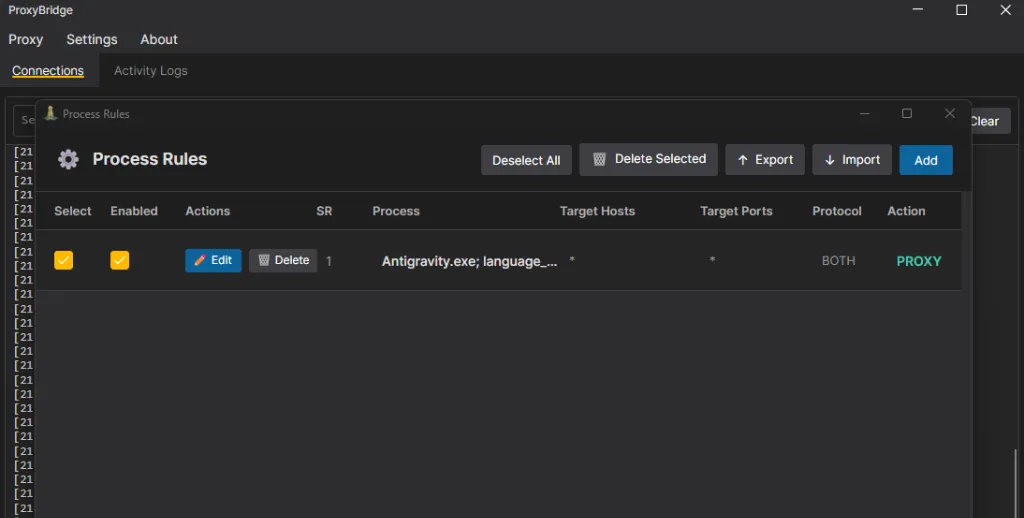 The core of this method is to download the Proxy Bridge software and force a proxy for the Antigravity.exe program within it. The specific steps are as follows: